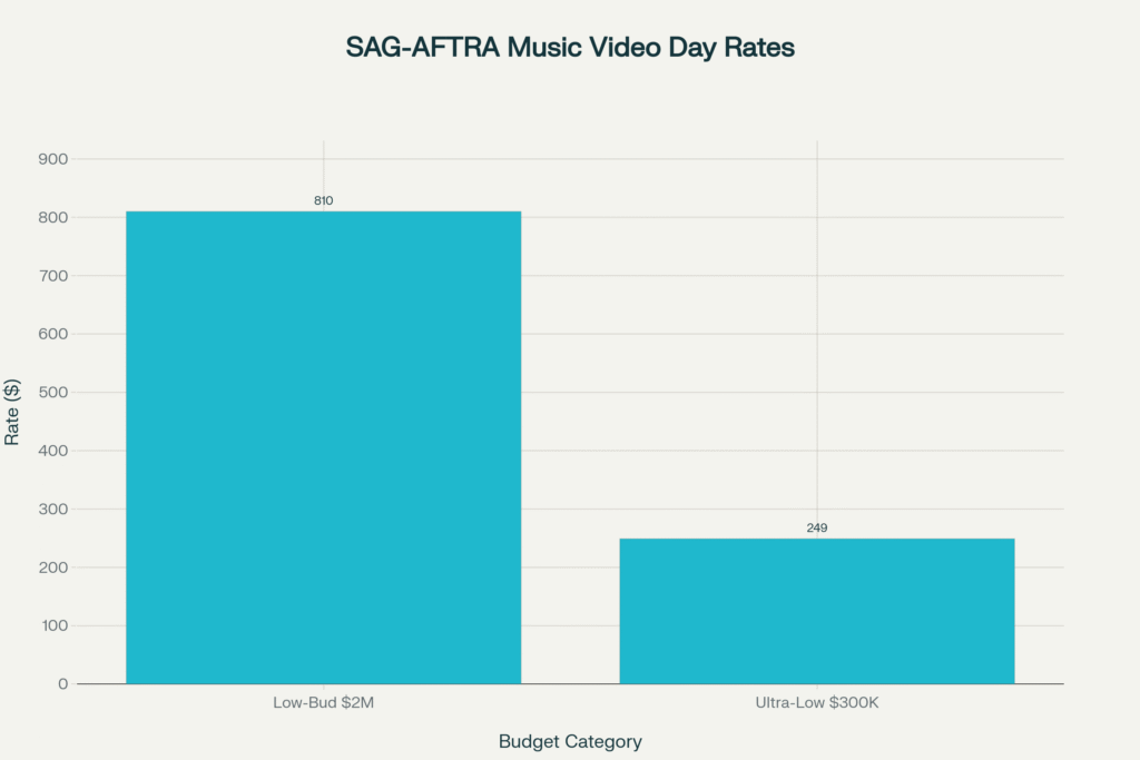 Figure: Under SAG-AFTRA’s Music Video agreement, a principal performer’s minimum day rate is $810 on low-budget shoots (up to $2M budget), whereas ultra-low-budget projects (≤$300K) pay only $249.